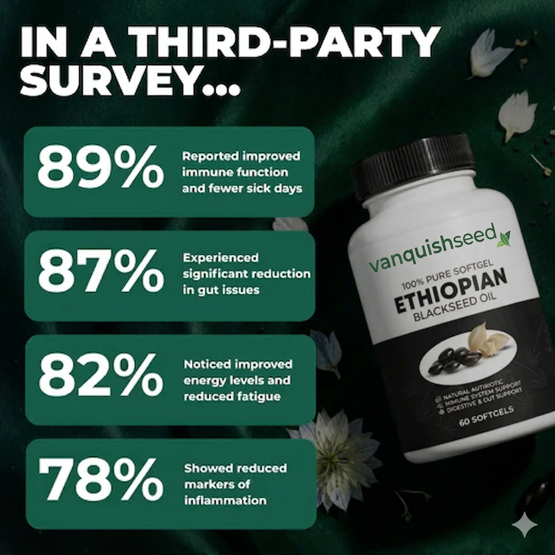 Vanquish Seed's Ethiopian Black Seed Oil is designed to eliminate parasites, fungal overgrowth, and chronic inflammation — the hidden root causes behind bloating, fatigue, brain fog, and weakened immunity.